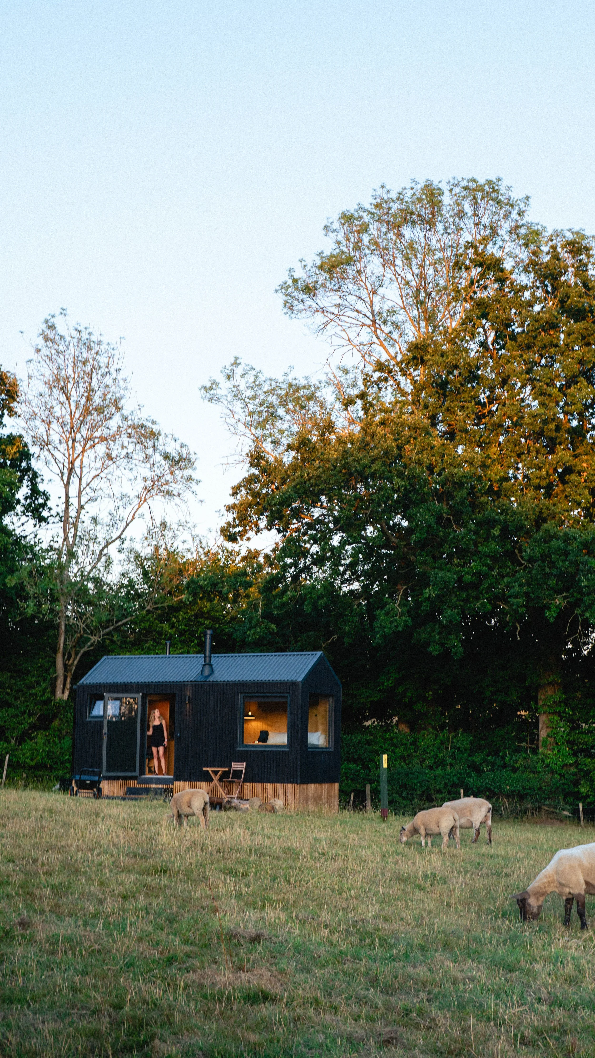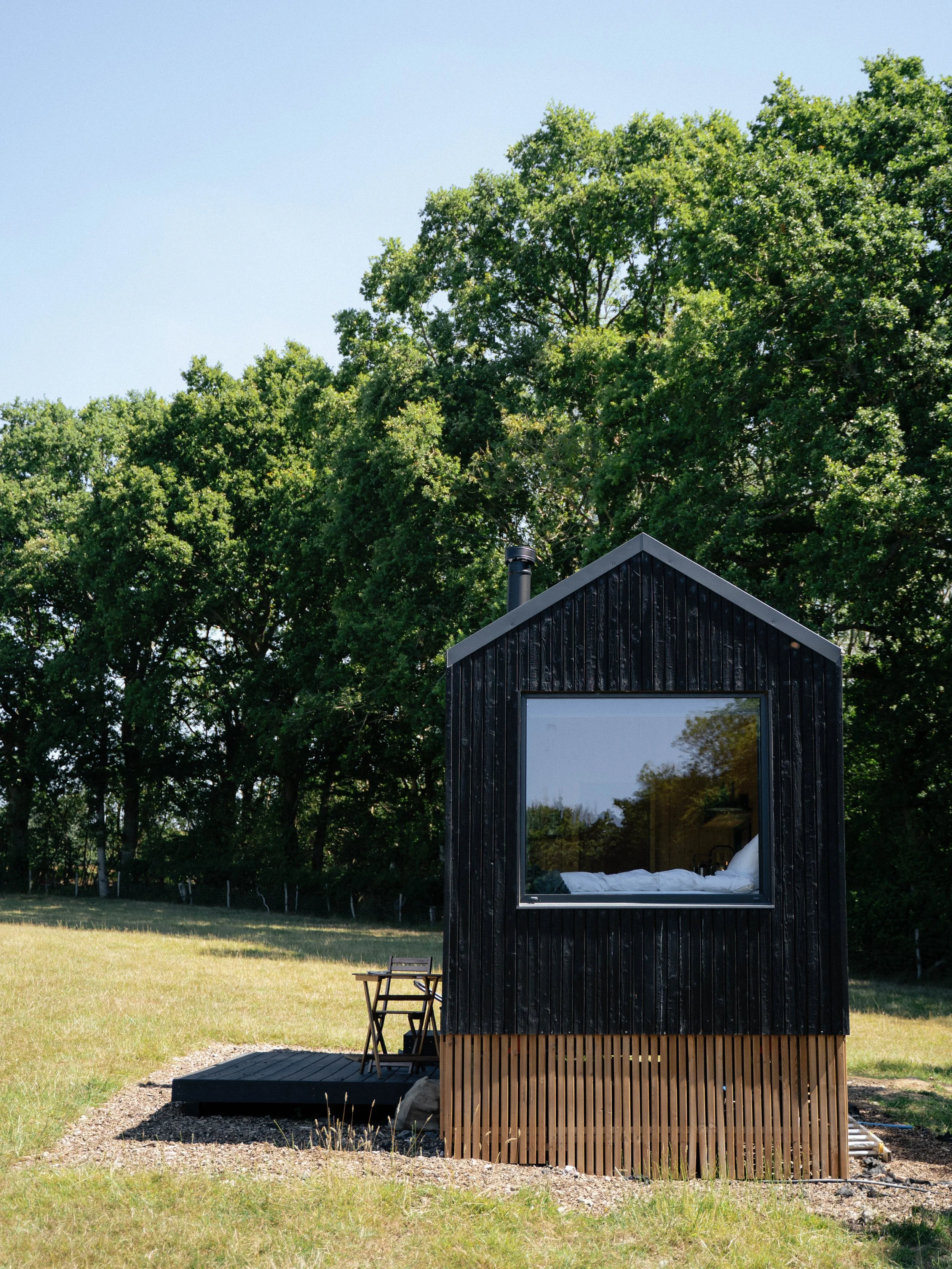 Small black wooden house with a large window showing the bed inside, in a field with green trees in the background.