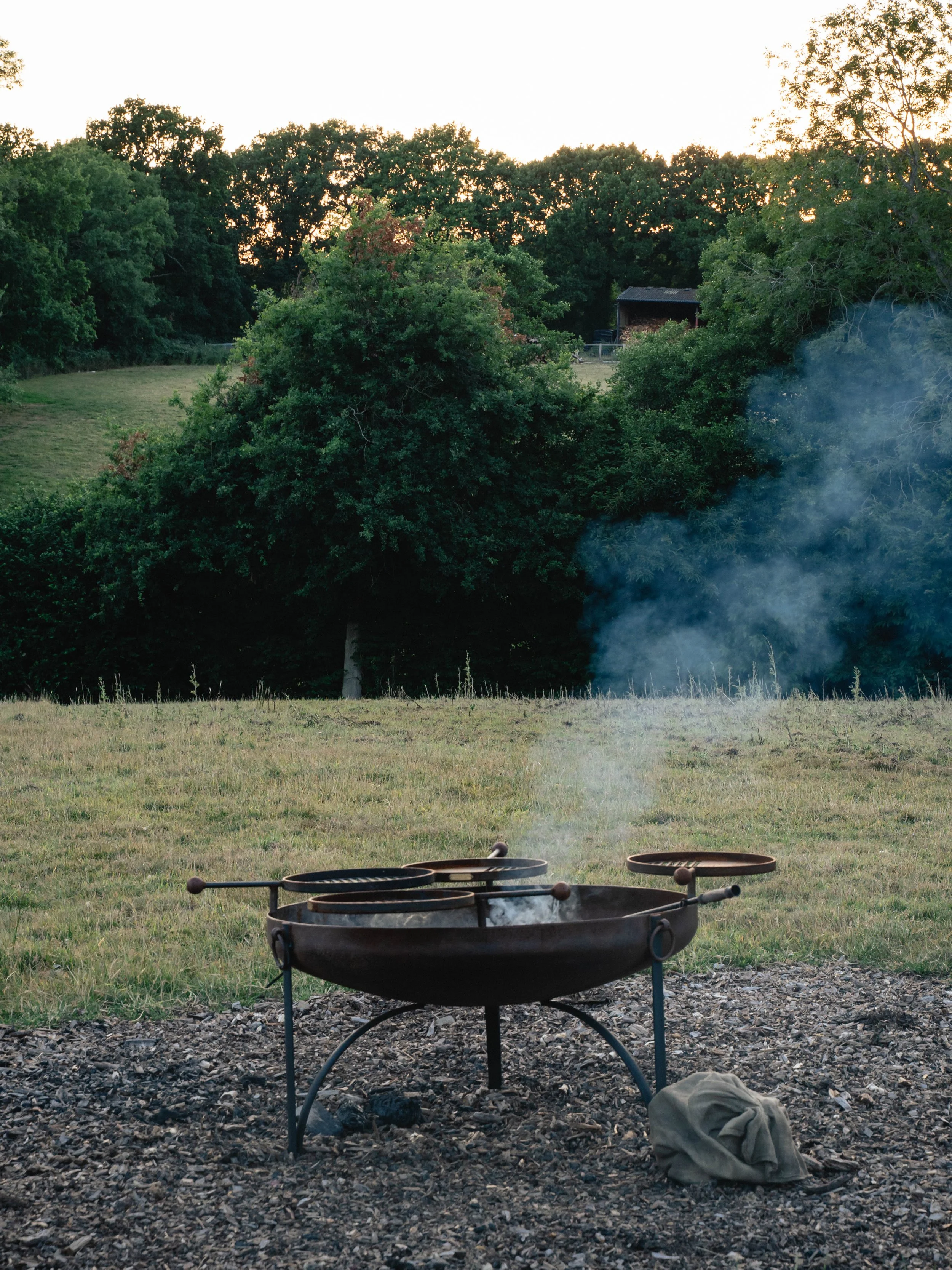 An outdoor scene with a circular metal fire pit on a gravel surface, emitting smoke, with trees and a grassy field in the background at sunset.