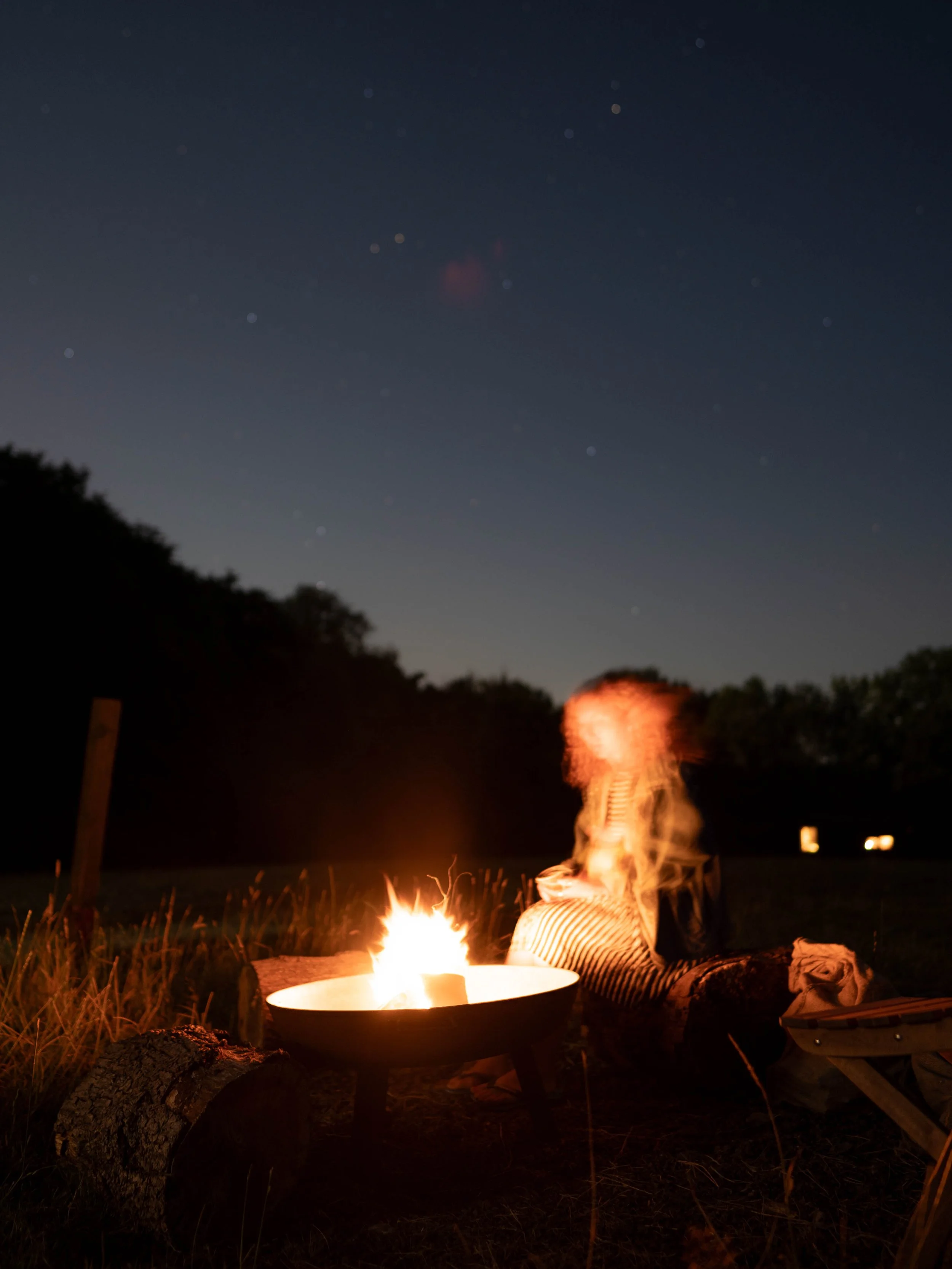 Person sitting by a campfire at night under a starry sky, surrounded by trees.