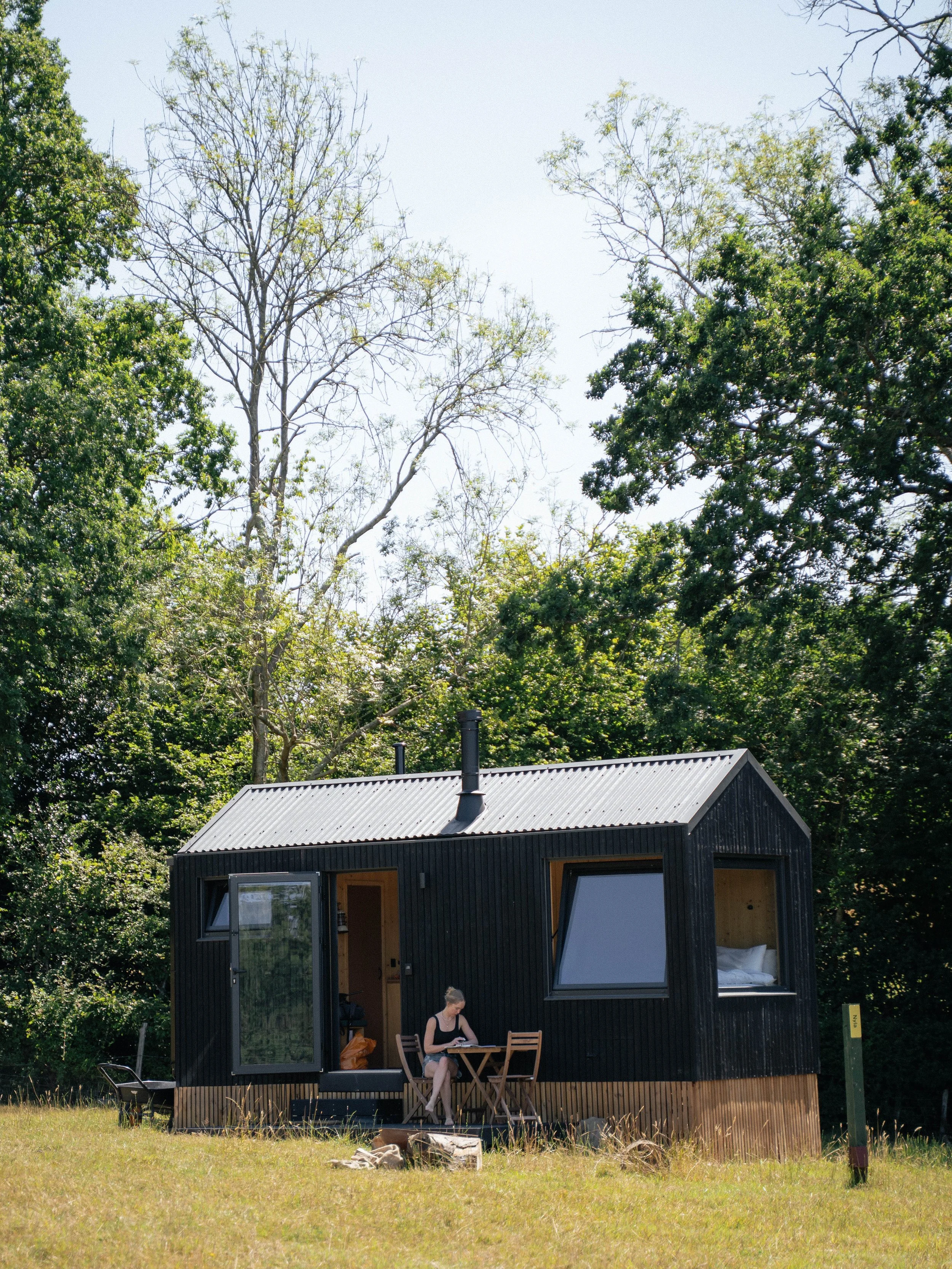 A small black cabin with a corrugated metal roof and large windows, situated on a grassy area surrounded by trees, with a woman sitting at a wooden table outside.