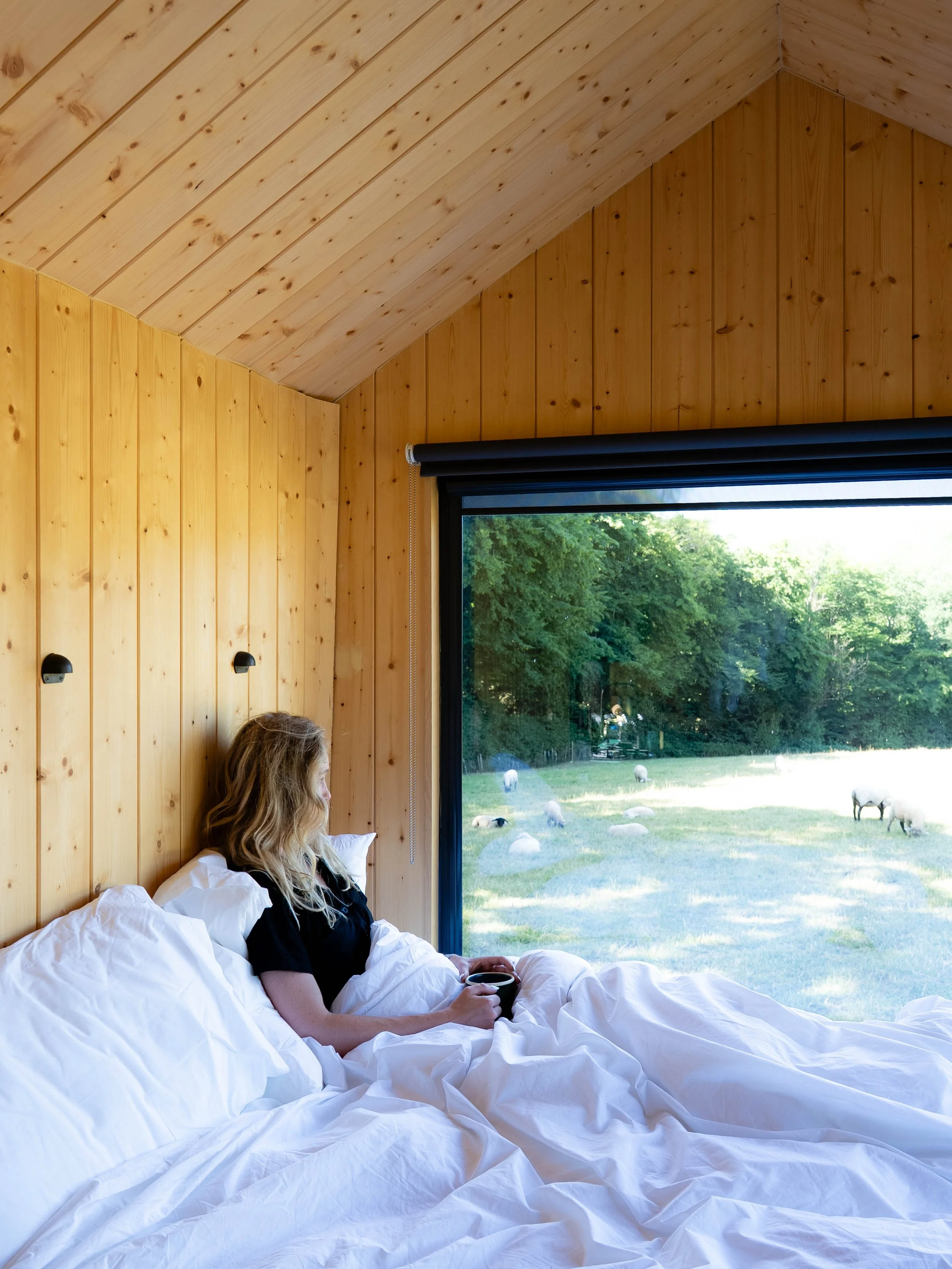 A woman sitting in bed in a wooden room, looking out the window at a grassy field with sheep.